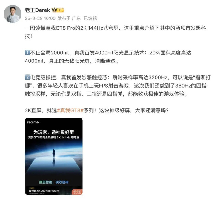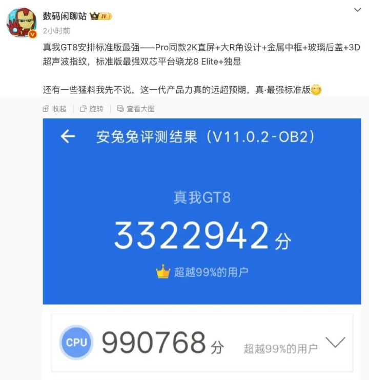 曝真我GT8骁龙8 Elite+独显双芯加持, Pro同款2K直屏